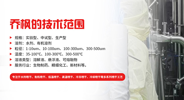 上海喬楓實業有限公司,成立于2012年,是從事噴霧干燥設備的研發設計、生產、銷售(小型噴霧干燥機,實驗型噴霧干燥機,35℃低溫噴霧干燥機有機溶劑噴霧干燥機低溫閉式循環噴霧干燥機超細粉末噴霧干燥機、噴霧冷凍干燥機、真空噴霧干燥機、氣流噴霧干燥機,噴霧造粒干燥機離心噴霧干燥機,沸騰制粒機等)和售后于一體的綜合性公司,本公司現成為一家致力于為生物制藥、精細化工、新能源、陶瓷造粒及食品工程等領域提供全套解決方案的整線交鑰匙工程企業。